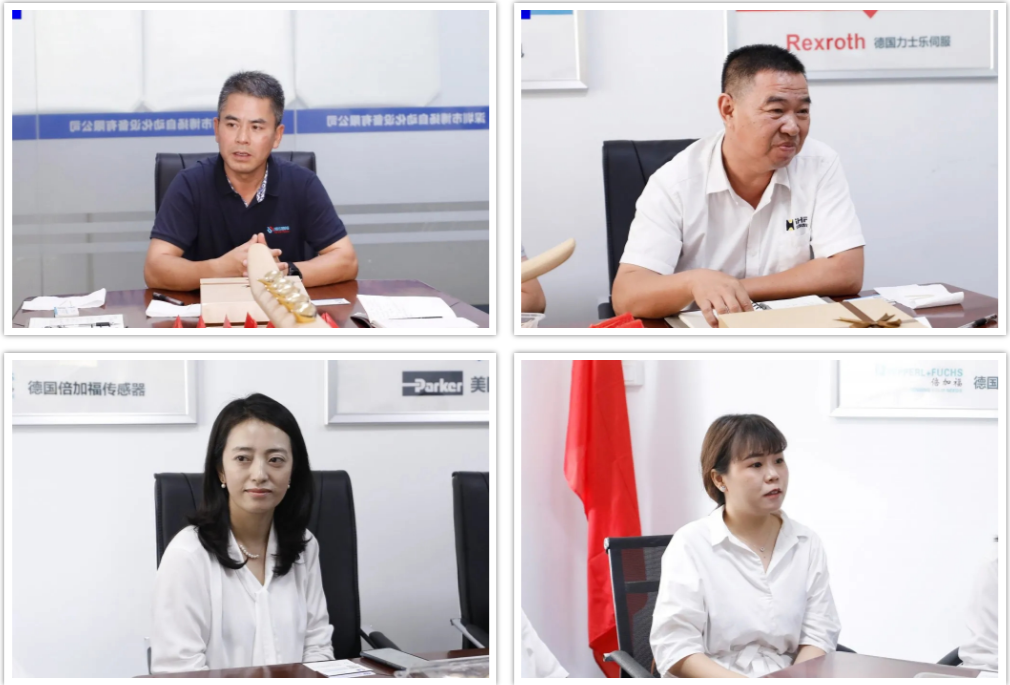 8月4日上午,寶安區智能制造行業協會秘書長熊艷,法律專業委員會弘商信息技術(深圳)有限公司經理張琪,金融服務深圳農商銀行上步支行行長助理鐘繼儀、客戶經理杜萍,副會長單位深圳市鑫承諾環保產業股份有限公司運營總經理孫洪彬,理事單位深圳市銳泰精密機械有限公司總經理施宇斌、深圳市合發齒輪機械有限公司劉新民、會員單位深圳市鴻發鑫科技有限公司總經理劉愛軍一行拜訪了我會副會長單位深圳市博揚智能裝備有限公司,博揚智能總經理劉國太盛情接待,并進行密切交流。